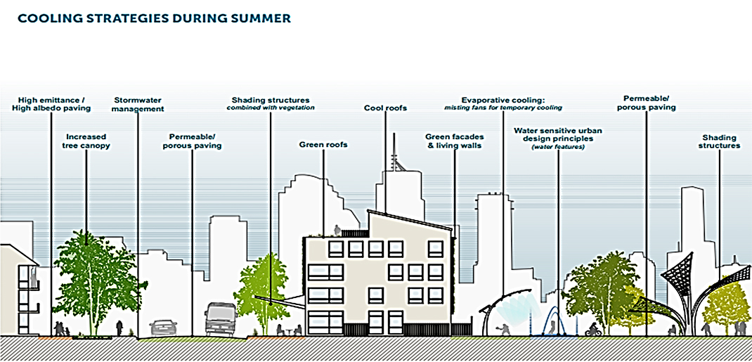 Οι σύγχρονες προδιαγραφές μιλούν για ψυχρά υλικά υψηλής ανακλαστικότητας, διαπερατές επιφάνειες που επιτρέπουν την απορρόφηση και την εξάτμιση του νερού, σκίαση με μεγάλα δέντρα, μικροκλιματική μελέτη και σχεδιασμό βασισμένο στη θερμική άνεση του ανθρώπου και όχι μόνο στην αισθητική. Παρά όμως τις διεθνείς αυτές κατευθύνσεις, το έργο υλοποιήθηκε με επιλογές που ενισχύουν το φαινόμενο της Αστικής Θερμικής Νησίδας. Σκληρές επιφάνειες, θερμοαπορροφητικά υλικά, περιορισμός ψηλών δέντρων και αντικατάσταση με θάμνους χαμηλής σκιαστικής ικανότητας.