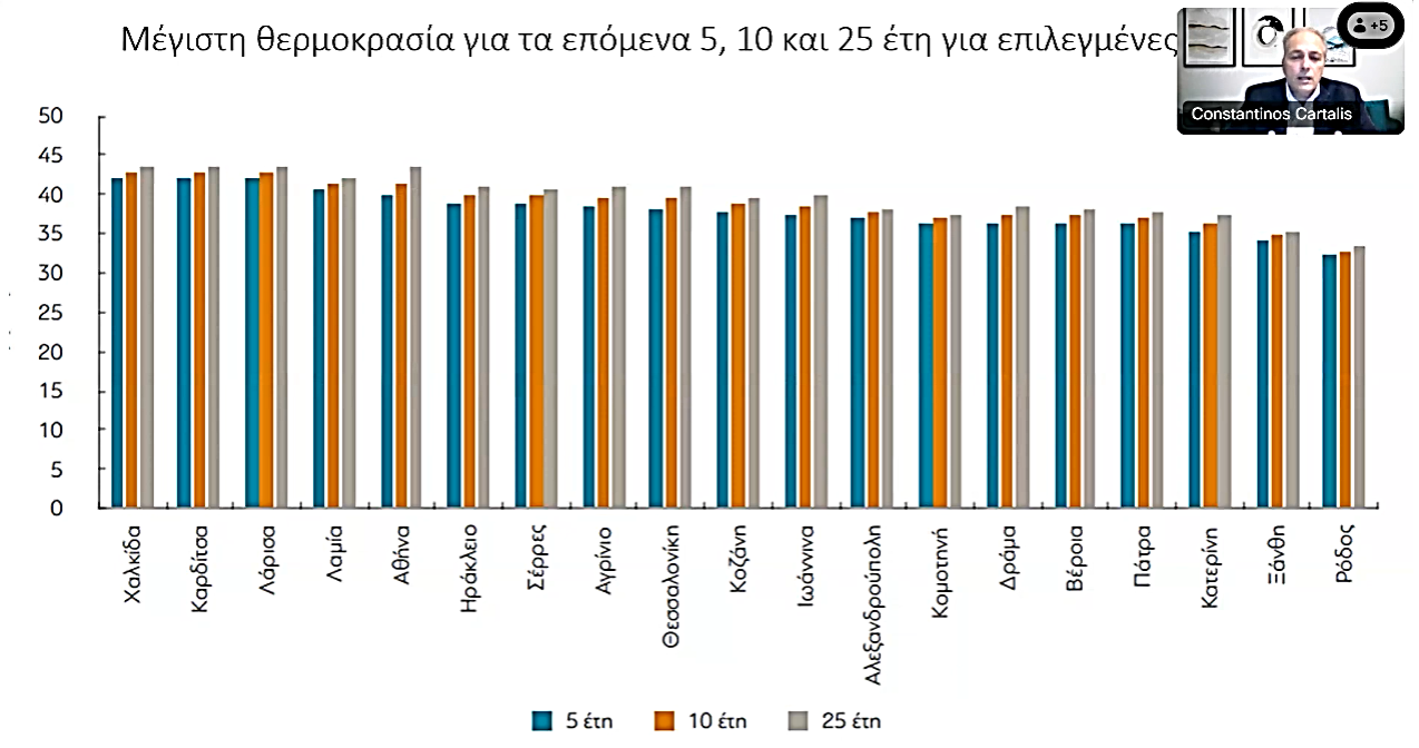 Και αυτό δεν είναι υπόθεση, είναι πλέον μετρήσιμο δεδομένο. Σε πρόσφατο επιστημονικό διάγραμμα προβλέψεων για τις μέγιστες θερμοκρασίες των επόμενων 5, 10 και 25 ετών σε μεγάλες ελληνικές πόλεις, η Χαλκίδα εμφανίζεται στην κορυφή της θερμικής επιβάρυνσης, παρότι βρίσκεται κυριολεκτικά μέσα στη θάλασσα, ένα στοιχείο που σε φυσιολογικές συνθήκες θα λειτουργούσε ως ρυθμιστής θερμοκρασίας.