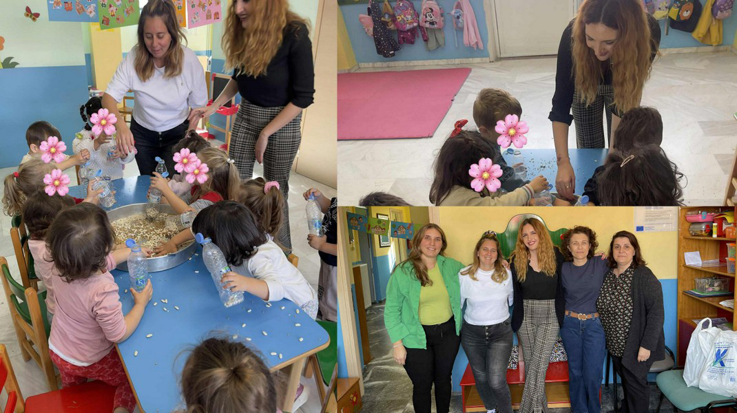 Στο εργαστήριο, τα παιδιά είχαν την ευκαιρία να πειραματιστούν με υλικά, να γεμίσουν μπουκάλια με όσπρια και να συγκρίνουν τους παραγόμενους ήχους, αναπτύσσοντας τη λεπτή κινητικότητα, την ακουστική διάκριση και την παρατηρητικότητά τους.