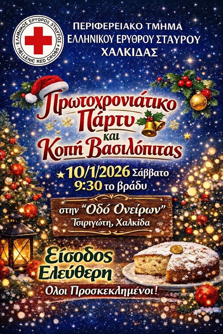 Με γιορτινή διάθεση και έντονο το μήνυμα της προσφοράς, το Περιφερειακό Τμήμα Χαλκίδας του Ελληνικού Ερυθρού Σταυρού διοργανώνει πρωτοχρονιάτικο πάρτι για την κοπή της καθιερωμένης βασιλόπιτας, το Σάββατο 10 Ιανουαρίου, στις 9:30 το βράδυ.