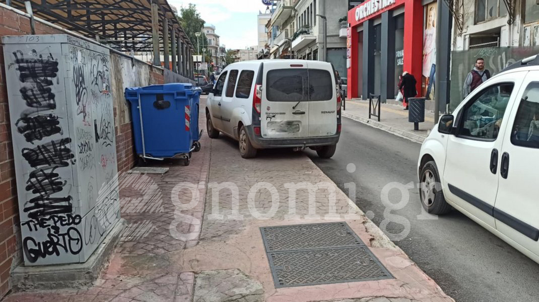 Όπως φαίνεται καθαρά, ένα φορτηγάκι έχει σταθμεύσει ολόκληρο επάνω στο πεζοδρόμιο, ακριβώς μπροστά από τους κάδους ανακύκλωσης, αφήνοντας ελάχιστο χώρο για τη διέλευση των πεζών.