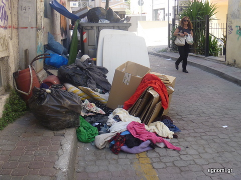 "Τα μπογαλάκια σου και δρόμο." Μάλλον αυτό έπαθε ο ιδιοκτήτης των ρούχων της φωτογραφίας. Τον πέταξε η γυναίκα του στο δρόμο και δεν του έδωσε ούτε βαλίτσα να βάλει τα ρούχα του. Οπότε κι αυτός τα πέταξε δίπλα στον κάδο απορριμμάτων στην οδό Αθηνάς.