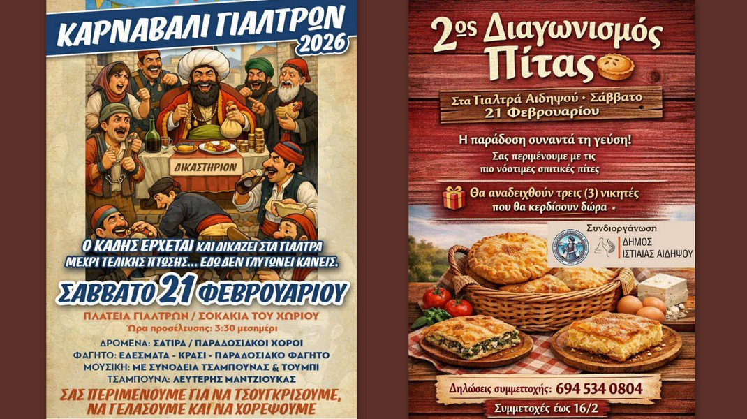 Στα Γιάλτρα Αιδηψού αναμένεται να εκτοξευτεί το κέφι το Σάββατο 21 Φεβρουαρίου, με καρναβάλι που αρχίζει από τις 3:30 το μεσημέρι και διαγωνισμό πίτας!