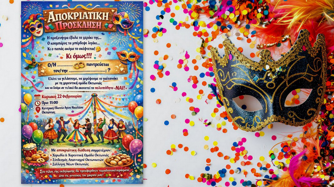 Σε ρυθμούς Αποκριάς θα κινηθεί η Οκτωνιά Ευβοίας, την Κυριακή 22 Φεβρουαρίου, στις 11 το πρωί, με ένα ξεχωριστό καρναβαλικό δρώμενο στην κεντρική πλατεία Αγίου Νικολάου.