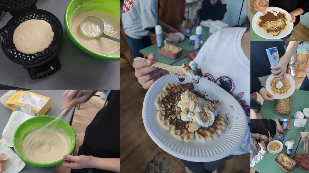 Αφού γνώρισαν το σχετικό λεξιλόγιο, εξασκήθηκαν σε διαλόγους και έμαθαν να παραγγέλνουν και να περιγράφουν στα γερμανικά υλικά και γευστικές προτιμήσεις, πέρασαν στο πιο απολαυστικό στάδιο, την παρασκευή λαχταριστών βάφλων μέσα στην τάξη.