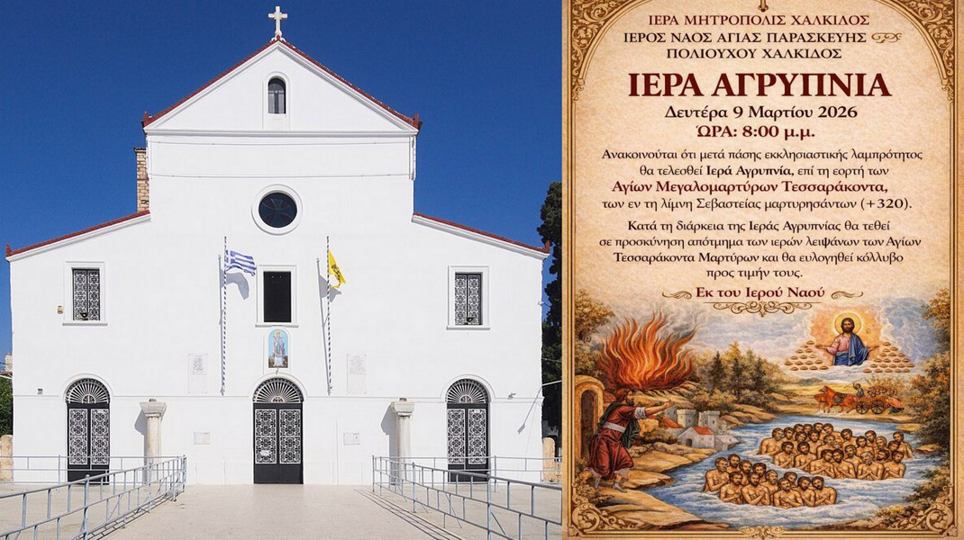 Την Δευτέρα 9 Μαρτίου, ημέρα εορτής των Αγίων 40 Μαρτύρων, που μαρτύρησαν στη λίμνη της Σεβάστειας, θα τελεστεί Ιερή Αγρυπνία στον Ιερό Ναό της Αγίας Παρασκευής, πολιούχου Χαλκίδας.