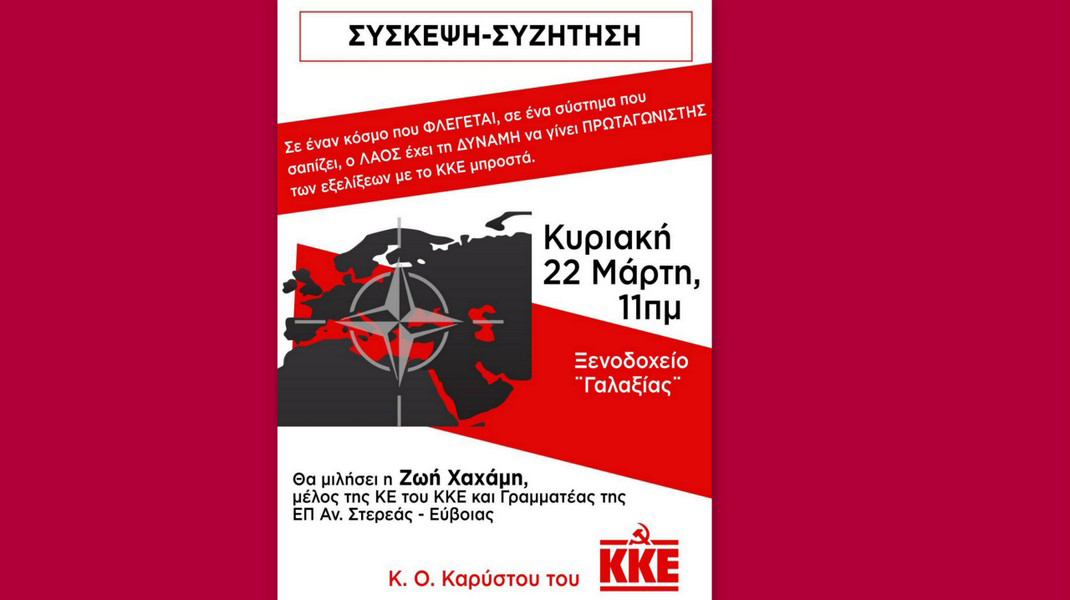Η Τοπική Οργάνωση Καρύστου του ΚΚΕ καλεί τους πολίτες σε εκδήλωση συζήτηση με τίτλο «Σε έναν κόσμο που φλέγεται, σε ένα σύστημα που σαπίζει, ο λαός έχει τη δύναμη να γίνει πρωταγωνιστής των εξελίξεων με το ΚΚΕ μπροστά».