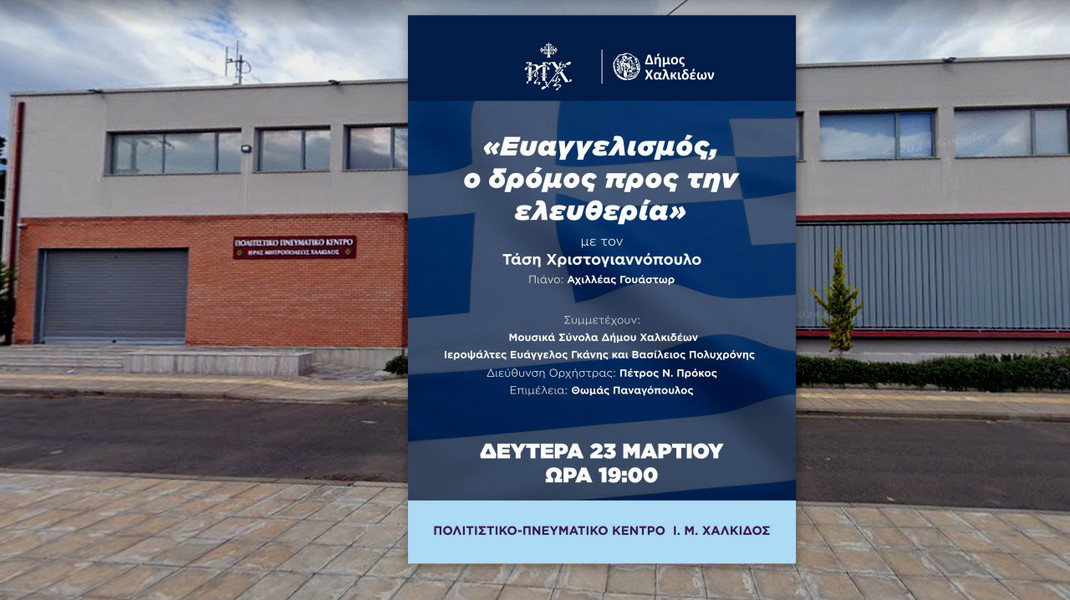 Η εκδήλωση θα πραγματοποιηθεί τη Δευτέρα 23 Μαρτίου, στις 7 το απόγευμα, στο Πολιτιστικό-Πνευματικό Κέντρο της Μητρόπολης Χαλκίδος.