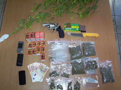Αρχικά, οι αστυνομικοί συνέλαβαν στον Αχινό Φθιώτιδας τον έναν 25χρονο. Μέσα στο αυτοκίνητό του βρήκαν ένα περίστροφο κρότου με 51 φυσίγγια και εφτά κάλυκες των 9 mm, ένα μαχαίρι, μια συσκευασία με 30 γρ. χασίς, τρία τσιγαριλίκια και τέσσερα σπιρτόκουτα που περιείχαν 7 γρ. χασίς.