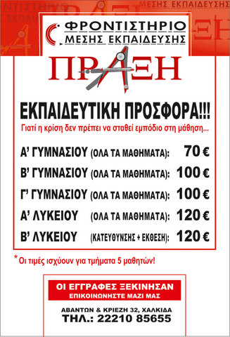 *Info: Φροντιστήριο Μέσης Εκπαίδευσης «Πράξη», Αβάντων & Κριεζή 32, Χαλκίδας, τηλ: 22210-85655.