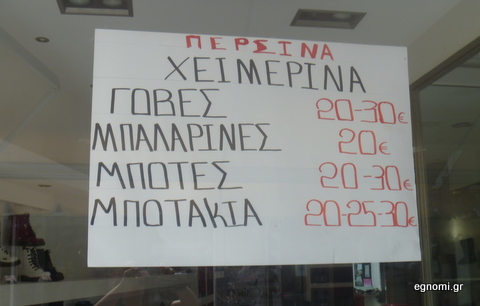 Διευκρινίζει ότι οι προσφορές, που αναγράφονται στην πινακίδα αφορούν σε περσινά χειμερινά υποδήματα, ώστε να μην υπάρχει περίπτωση να παραπλανηθεί κάποιος πελάτης. Πρόκειται για μία μάλλον δυσεύρετη ελικρίνεια!