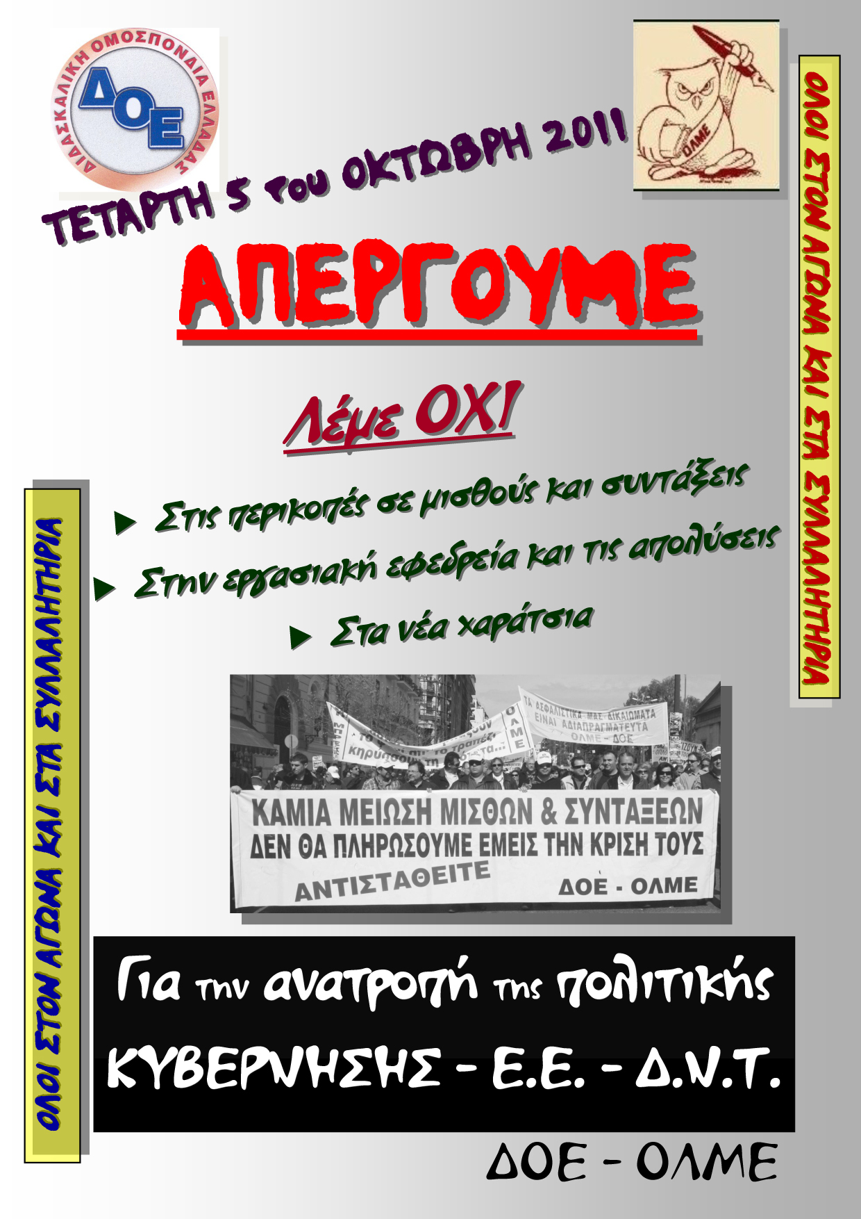 H έξαλλη κουκουβάγια φιγουράρει όπως την βλέπετε (φωτο πάνω δεξιά) στο σήμα της OΛME, της συνδικαλιστικής Oμοσπονδίας των καθηγητών. H κουκουβάγια λοιπόν, η OΛME και ΔOE (Διδακαλική Oμοσπονδία Eλλάδας) καλούν όλους τους εκπαιδευτικούς σε απεργία αύριο Tετάρτη 5 Oκτώβρη, με την πάρακάτω αφίσα...