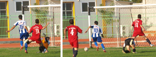 Το μοναδικό γκολ του αγώνα σημειώθηκε στις αρχές του Β' ημιχρόνου. Ενα λάθος στην άμυνα των γηπεδούχων (πάνω), μετά από σέντρα στα καρέ της, έδωσε την ευκαιρία στον Δημήτρη Βεζιρτζόγλου να μπει σφήνα (κάτω) στον Ντουμάνη και τον Παπαδέδε, να τους κερδίσει την μπάλα και να την στείλει στα δίχτυα Μ' αυτό τον τρόπο σημειώθηκε το τέρμα με το οποίο η Κύμη πήρε την πρόκριση στους 8 του κυπέλλου.