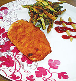 Κόβω τα στήθη στη μέση και χτυπώ κάθε κομμάτι ελαφρά (αν δεν έχω το κατάλληλο εργαλείο, χρησιμοποιώ πλάστη) για να λεπτύνει λίγο. Καρυκεύω το κοτόπουλο και από τις δύο πλευρές. Ανακατεύω σε μπολ το αβγό με το γάλα. Πανάρω το κρέας περνώντας το πρώτα από το αλεύρι, αφού το τινάξω, το βουτώ στο μείγμα του γάλακτος και αμέσως μετά το τυλίγω με τη φρυγανιά. Τηγανίζω σε μέτρια προς δυνατή φωτιά 4 περίπου λεπτά από την κάθε πλευρά και σερβίρω αμέσως με τηγανητά κολοκυθάκια, μουστάρδα και κέτσαπ.