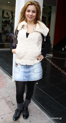 Σηκώνεται το πρωί. Αποφασίζει να βάλει την αγαπημένη της τζιν φούστα. Τη συνδυάζει με μαύρο καλσόν (βλέπετε ήρθε ο χειμώνας) και γκρι γκέτες. Από πάνω η Χαρούλα Πασχάλη φοράει μαύρο μπλουζάκι (ασορτί με το μανόν στα νύχια) και στο τέλος συμπληρώνει με ένα αμάνικο sheep-skin ή κατά το ελληνικότερον με μία ωραιότατη προβιά. Ετοιμη!