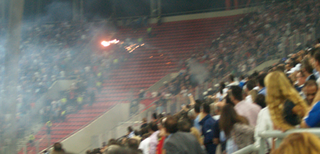Ο νεαρός είχε πάει να παρακολουθήσει τον αγώνα βόλει μεταξύ του ΠΑΟ και του Αρη Μαρμούρης, αλλά είχε πάρει και...παρεούλα μαζί του. Κατείχε έναν πυρσό κομμένο από πίσω μέσα στον οποίο είχε κρύψει ο τρεις φωτοβολίδες και τρία καψύλλια. Επίσης, είχε και μία συσκευή εκτόξευσης φωτοβολίδων τύπου στιλό.