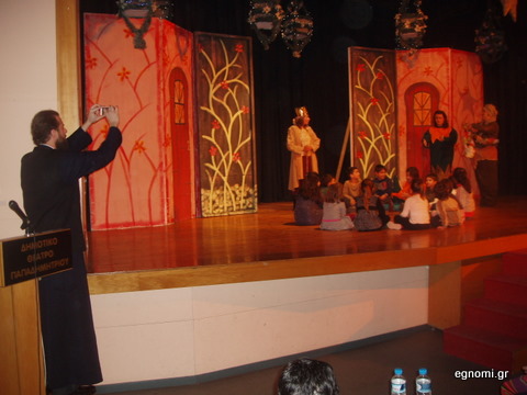 Όλο αυτό το σκηνικό παρέσυρε και τον πατέρα Φιλόθεο, ο οποίος έγινε ένα με τα παιδιά, χτυπώντας παλαμάκια μαζί τους στα τραγούδια του έργου, παίρνοντας μέρος παράλληλα και στα παραπάνω ηχητικά εφέ. Μάλιστα σηκώθηκε κάποια στιγμή από τη θέση του για να τραβήξει και φωτογραφίες τους ηθοποιούς (φωτό αριστερά).