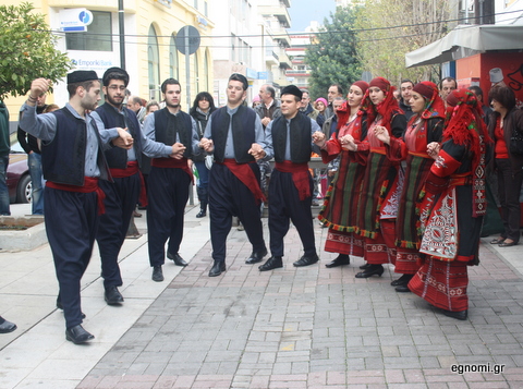 Από τις 9:30 το πρωί τα μέλη του Χορευτικού Συλλόγου μαζί με τον δάσκαλο παραδοσιακών χορών, Βαγγέλη Κυριακόπουλο και τον πρόεδρο του συλλόγου, Τάκη Βαχαβιόλο (φωτο κάτω), ξεχύθηκαν στους δρόμους χορεύοντας υπό τη μουσική υπόκρουση συγκροτήματος από τις Σέρρες, το οποίο έπαιζε παραδοσιακά μακεδονίτικα τραγούδια.