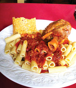 Φέρνω σε βρασμό, χαμηλώνω, σκεπάζω και αφήνω να σιγοβράσει για 2,5 περίπου ώρες. Σερβίρω με μακαρόνια τα οποία βράζω ξεχωριστά.