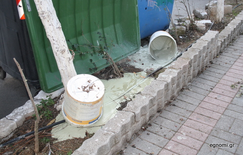 Ο τύπος έβαψε στο σπίτι ή το μαγαζί του και το χρώμα που περίσσεψε έκρινε σκόπιμο να το χύσει στο παρτέρι, δίπλα στους κάδους απορριμμάτων, στην οδό Μιαούλη, αδιαφορώντας για την ζημιά που προκλήθηκε και ποιος θα την καθαρίσει.