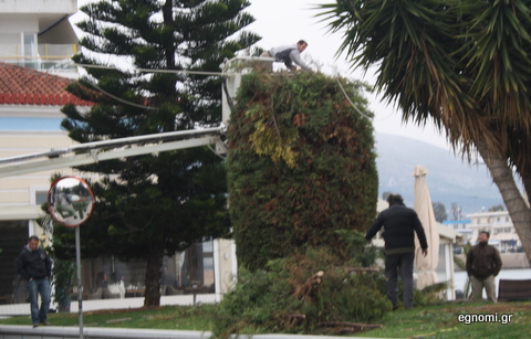 Συνεργείο του Δήμου, με γερανοφόρο όχημα κλάδεψε τα δένδρα στο μεγάλο παρτέρι, που βρίσκεται στο άγαλμα της Εθνικής Αντίστασης και οι περαστικοί κοίταζαν με περιέργεια τις εργασίες.