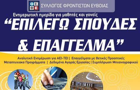 Ενημερωτική ημερίδα για μαθητές και γονείς, με τίτλο "Επιλέγω σπουδές και επάγγελμα" διοργανώνει η Ένωση Φροντιστών Εύβοιας, την Κυριακή 11 Μαρτίου, στις 11 το πρωί, στην αίθουσα εκδηλώσεων του Λυκείου Ιστιαίας.