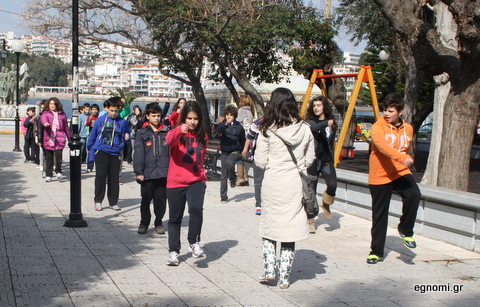 Στη φωτογραφία οι μαθητές του 20ου Δημοτικού σχολείου Χαλκίδας επιστρέφουν στο σχολείο τους μετά την πρόβα που έκαναν για την παρέλαση στο κρηπίδωμα της παραλίας.