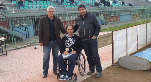 Υπενθυμίζουμε ότι ο Γιώργος τραυματίστηκε πριν ένα χρόνο στη διάρκεια προπόνησης με μηχανή motocross και από τότε κινείται με αναπηρικό καροτσάκι. Ωστόσο, έχει μεγάλη θέληση και το παλεύει σκληρά ώστε να μπορέσει να συγκεντρώσει τις 100.000 ευρώ που απαιτούνται για την εγχείρισή του και να μπορέσει να ξαναπερπατήσει. (Στη φωτό πάνω ο πρόεδρος του Δ.Σ. Γιάννης Παπακωνσταντίνου και ο αναπληρωτης ταμίας Γιώργος Αλαφάκης με τον Γιώργο).