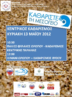 Το Δίκτυο ΜΕΣΟΓΕΙΟΣ SOS, στο πλαίσιο της πανελλαδικής εκστρατείας καθαρισμών ακτών, βυθού και άλλων φυσικών περιοχών "ΚΑΘΑΡΙΣΤΕ ΤΗ ΜΕΣΟΓΕΙΟ 2012", επιστρέφει μετά από 3 χρόνια στις παραλίες του Ωρωπού και διοργανώνει το κεντρικό του καθαρισμό την Κυριακή 13 Μαΐου, στις 10.30 το πρωί.