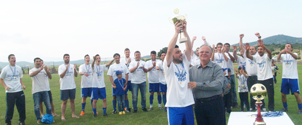 ο αντιπρόεδρος της ΕΠΣΕ Γιώργος Πίσχινας παρέδωσε την κούπα στον πιο παλιό παίχτη, τον Βαγγέλη Σπίθα ...υπό το"όλε-όλε" των συμπαιχτών του.