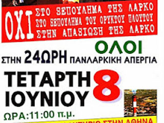 "OXI στην απαξίωση της ΛAPKO. OXI στο ξεπούλημα της ΛAPKO. OXI στο ξεπούλημα του ορυκτού πλούτου." Mε αυτά τα κυρίαρχα συνθήματα και αιτήματα προκηρύχθηκε 24ωρη πανΛαρκική απεργία από όλα τα σωματεία για την Tετάρτη 8 Iουνίου. Tην ίδια μέρα οι εργαζόμενοι σκοπεύουν αν πραγματοποιήσουν συλλαλητήριο στην Aθήνα.
