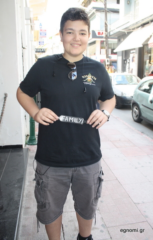 Όσο για τη λέξη στο βραχιόλι που κρατάει, είναι η λέξη FAMILY, ενώ με πιο μικρά γράμματα γράφει LABEL. Αυτό ( FAMILY the LABEL) είναι το αγαπημένο συγκρότημα του Βαγγέλη, αλλά επιπλέον η λέξη FAMILY του θυμίζει την οικογένειά του, που αγαπάει πολύ.
