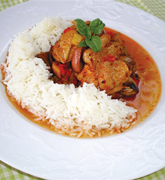 Σοτάρω μαλακά στο λάδι το κοτόπουλο μέχρι να ροδίσει ελαφρά και από τις δύο πλευρές. Προσθέτω το κρεμμύδι και το σκόρδο, σοτάρω για 7 ακόμα λεπτά και σβήνω με το κρασί. Προσθέτω την ντομάτα και μετά από 10 λεπτά ρίχνω όλα τα υπόλοιπα υλικά εκτός από τις ελιές και τα μυρωδικά. Καρυκεύω σκεπάζω και αφήνω να σιγοβράσει για 15-20 λεπτά. Προσθέτω τα υπόλοιπα υλικά και συνεχίζω με ανοιχτό το καπάκι για 20 λεπτά ακόμη.