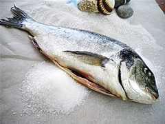 Πλένω καλά το ψάρι και το καθαρίζω από τα εντόσθια. Δεν το καθαρίζω από τα λέπια. Βάζω στην κοιλιά του το λεμόνι και τα μυρωδικά. Στρώνω ένα ταψάκι στο μέγεθος του ψαριού και λίγο μεγαλύτερο με αντικολλητικό χαρτί. Ρίχνω το μισό αλάτι δημιουργώντας ένα “στρώμα” λίγο μεγαλύτερο από το μέγεθος του ψαριού. Ακουμπάω το ψάρι και το "χτίζω" με το υπόλοιπο αλάτι έτσι ώστε να καλυφθεί τελείως. Ραντίζω το αλάτι με νερό και προθερμαίνω το φούρνο στους 220 βαθμούς. Βάζω μέσα το ψάρι και κατεβάζω στους 200 βαθμούς. Ψήνω 40 λεπτά και αφού το βγάλω από το φούρνο, με μικρό σφυράκι σπάζω προσεκτικά την κρούστα του αλατιού και αφαιρώ το ψάρι ολόκληρο. Με βουρτσάκι καθαρίζω τυχόν υπολείμματα αλατιού από το ψάρι και σερβίρω αμέσως.