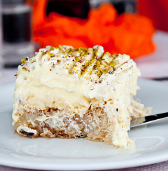 Ρίχνω το σιρόπι χλιαρό στο ζεστό φύλλο και αφήνω να κρυώσει καλά. Στρώνω την κρέμα πάνω στο φύλλο και γαρνίρω με τα φιστίκια. Τοποθετώ στο ψυγείο για 3 ώρες τουλάχιστον πριν σερβίρω.