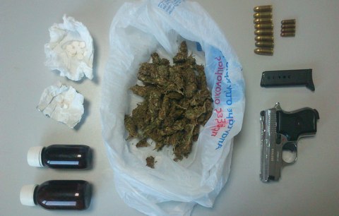 Ένα πιστόλι με γεμιστήρα, δώδεκα φυσίγγια διαφόρων τύπων, δύο μπουκάλια, τα οποία περιείχαν μεθαδόνη, συνολικού καθαρού βάρους 126,5 γραμμαρίων, μία σακούλα, η οποία περιείχε ακατέργαστη κάνναβη, σε μορφή αποξηραμένων φύλλων, μεικτού βάρους 50 γραμμαρίων και εννέα ναρκωτικά χάπια.