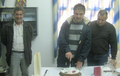 Στην επόμενη φωτό ο διευθυντής Σπύρος Αθανασίου κόβει την πίτα, πλαισιωμένος από τον πρόεδρο του Σωματείου Ζήση Μανούσο (δεξιά) και τον διοικητή της Εξωτερικής Φρουράς Δημήτρη Κόκκκινο (αριστερά).