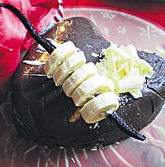 Προσθέτω στην κρέμα γάλακτος τη βανίλια και τη ζεσταίνω ελαφρά χωρίς να τη φέρω σε βρασμό. Κόβω και τις δύο σοκολάτες σε κομματάκια και τα προσθέτω στην κρέμα. Ανακατεύω μέχρι να λιώσουν οι σοκολάτες και αποσύρω. Στρώνω μικρή φόρμα σε σχήμα καρδιάς με διάφανη μεμβράνη, τοποθετώ τις μπανάνες ολόκληρες και αδειάζω το μείγμα της σοκολάτας. Τοποθετώ στο ψυγείο για μερικές ώρες. Ξεφορμάρω τη σοκολατένια καρδιά και τη διακοσμώ με ξύσμα λευκής σοκολάτας και φέτες μπανάνας.