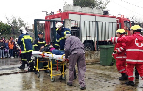 Πυροσβεστικά οχήματα, ασθενοφόρα, εθελοντές διασώστες κατέφθασαν στο Γυμνάσιο Γυμνού του Δήμου Ερέτριας, όπου ένας ισχυρός σεισμός είχε προκαλέσει τον τραυματισμό μαθητών, ενώ οι υπόλοιποι πραγματοποιούσαν συντεταγμένα εκκένωση του κτηρίου.