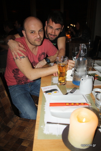 Από τις πιο χαλαρές παρέες ο Γιώργος Γροντής με τον Μηνά Ατταλη, οι οποίοι σερβιρίστηκαν απωανατολίτικες λιχουδιές με βάση το σολωμό και τον τόνο. "Είναι ωραία και αξίζει επαίνους η προσπάθεια που κάνει το Stavento να μας γνωρίσει με τις κουζίνες άλλων χωρών" τόνισαν τα παιδιά.