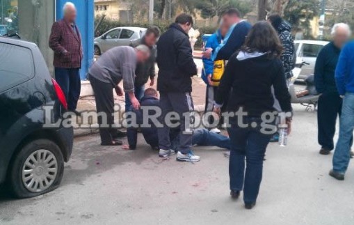 Στη φωτογραφία ο άτυχος έμπορος βρίσκεται τραυματισμένος στο οδόστρωμα και γύρω του περαστικοί, οι οποίοι έσπευσαν για βοήθεια.