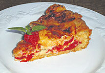Ψήνω στους 160 βαθμούς για 45-50 λεπτά. Αφήνω την τάρτα τουλάχιστον 1 ώρα πριν την κόψω και τη γαρνίρω με φιλέτα ντομάτας, αν θέλω.