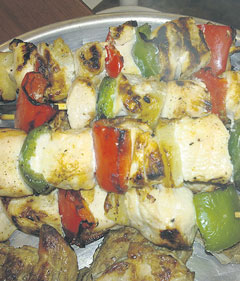 Κόβω το κρέας σε μεγάλους κύβους. Ανακατεύω σε γυάλινο μπολ τα πρώτα 7 υλικά και προσθέτω στη μαρινάδα το κοτόπουλο. Σκεπάζω και τοποθετώ στο ψυγείο για 10 ώρες. Την επομένη περνώ το κρέας στα σουβλάκια εναλλάξ με τις πιπεριές και ψήνω σε μπάρμπεκιου ή στη σχάρα του φούρνου και στους 220 βαθμούς τα σουβλάκια (20 λεπτά). Στο μεταξύ τοποθετώ τη μαρινάδα σε κατσαρολίτσα φέρνω σε βρασμό και αφού σιγοβράσω για 10 λεπτά, τη σερβίρω μαζί με τα σουβλάκια.