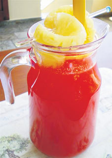 Σε μεγάλη κανάτα ανακατεύω καλά όλα τα υλικά εκτός από τη σόδα και τον πάγο (διατηρώ μερικές ώρες στο ψυγείο).