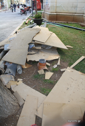 Όπως βλέπετε και στη φωτογραφία, η εικόνα που παρουσιάζει ο χώρος δεν περιποιεί τιμή ούτε στα μέλη του συνεργείου, ούτε στον ιδιοκτήτη του καταστήματος, οι οποίοι κοίταξαν μόνο την ευκολία τους, χωρίς να ενδιαφερθούν για την αισθητική ρύπανση αφενός και την προσβολή της ιερότητας του χώρου αφετέρου.