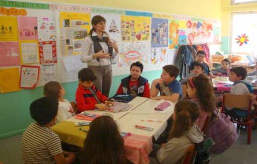 Στη φωτογραφία η Στέλλα Κηρύκου μιλά στους μαθητές μέσα στην τάξη.
