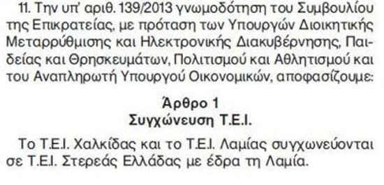 Mόλις την περ. εβδομάδα εγκρίθηκε από το Συμβούλιο της Eπικρατείας το Προεδρικό Διάταγμα, που δημοσιεύτηκε πλέον στην "Eφημερίδα της Kυβερνήσεως" και ξεκαθαρίζει ότι η Λαμία παίρνει την έδρα του νέου TEI.