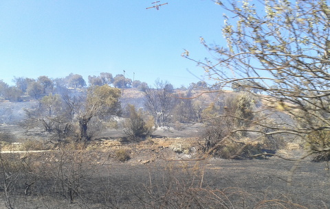 Σύμφωνα με εκτιμήσεις, μέχρι στιγμής έχουν απανθρακωθεί 1000 στρέμματα αγροτικών και δασικών εκτάσεων, ανάμεσα στις οποίες και πολλές καλλιέργειες με ελιές, όπως μπορείτε να δείτε και στη φωτογραφία πάνω.