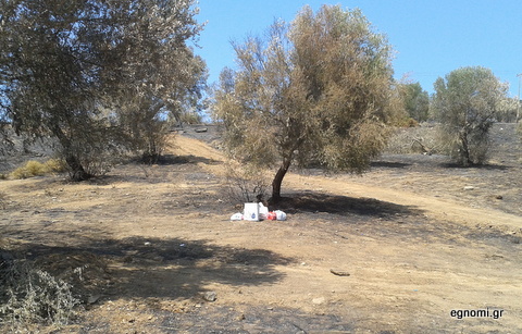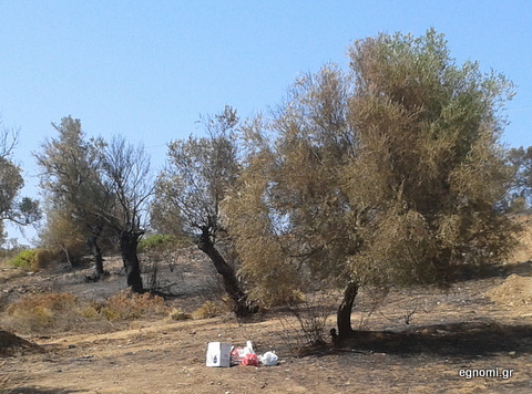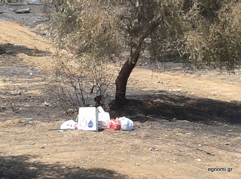 Οι φλόγες έκαψαν ελαιόδενδρα, χορτολιβαδική και δασική έκταση, αλλά δεν κατάφεραν να ... κάψουν την παραδοσιακή ελληνική γαϊδουριά. Κάποιοι έκριναν σκόπιμο να παρατήσουν τα σκουπίδια τους στην καμένη γη, αντί να τα πάρουν μαζί τους και να τα πετάξουν σε κάποιο κάδο απορριμμάτων.