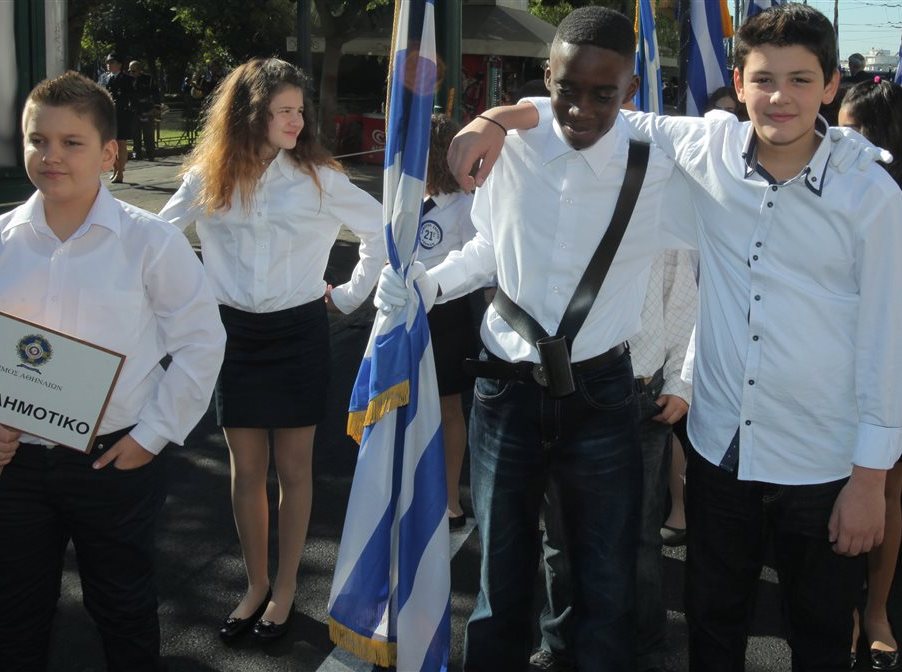 Είναι από τη σημερινή παρέλαση για την 28η Οκτωβρίου και απεικονίζει τον έγχρωμο σημαιοφόρο του 20ου Δημοτικού Σχολείου Αθήνας αγκαλιά με ένα συμμαθητή του.